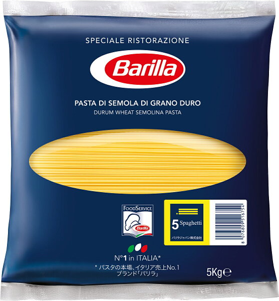 パスタの国イタリアで人気NO.1のブランド<バリラ>は140年の歴史を誇る老舗ブランド。そのバリラの中で最もポピュラーなのがロングパスタ。テフロンダイスと独自の製法により生み出されるツルツルの食感はご家庭でもプロの味としてお楽しみいただけます。原料の小麦はタンパク質量12.5%〜13%のデュアル小麦のセモリナを使用しています。 【麺の太さ】1.8mm 【内容量】5kg(一人分80gとして約62人分) 【原産国】イタリア 【原材料】デュラム小麦のセモリナ 【標準ゆで時間】9分 【賞味期間】製造後32ヶ月 【サイズ】36.5cm×30cm×7cm ※この商品は日本語の表示が印刷されています。 <商品の内容・パッケージについて> 正しい商品情報を掲載するよう努めておりますが、急な変更などによりお届け商品とサイト上の表記・パッケージが異なる場合がございます。悪しからずご容赦下さい。バリラ パスタ ロングパスタ▸▸ゲリラセールや◂◂ここだけのお得情報も!▸▸メルマガ登録◂◂ ▸▸セール開始や◂◂ポイント UPをお知らせ!▸▸お気に入り登録◂◂